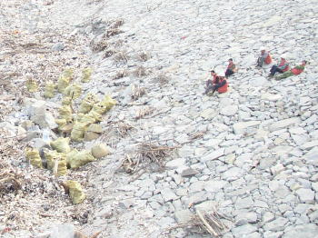 | 当日の流水量と水位表示計 | 岸に流れ着いたゴミは廃棄、流木は薪に |